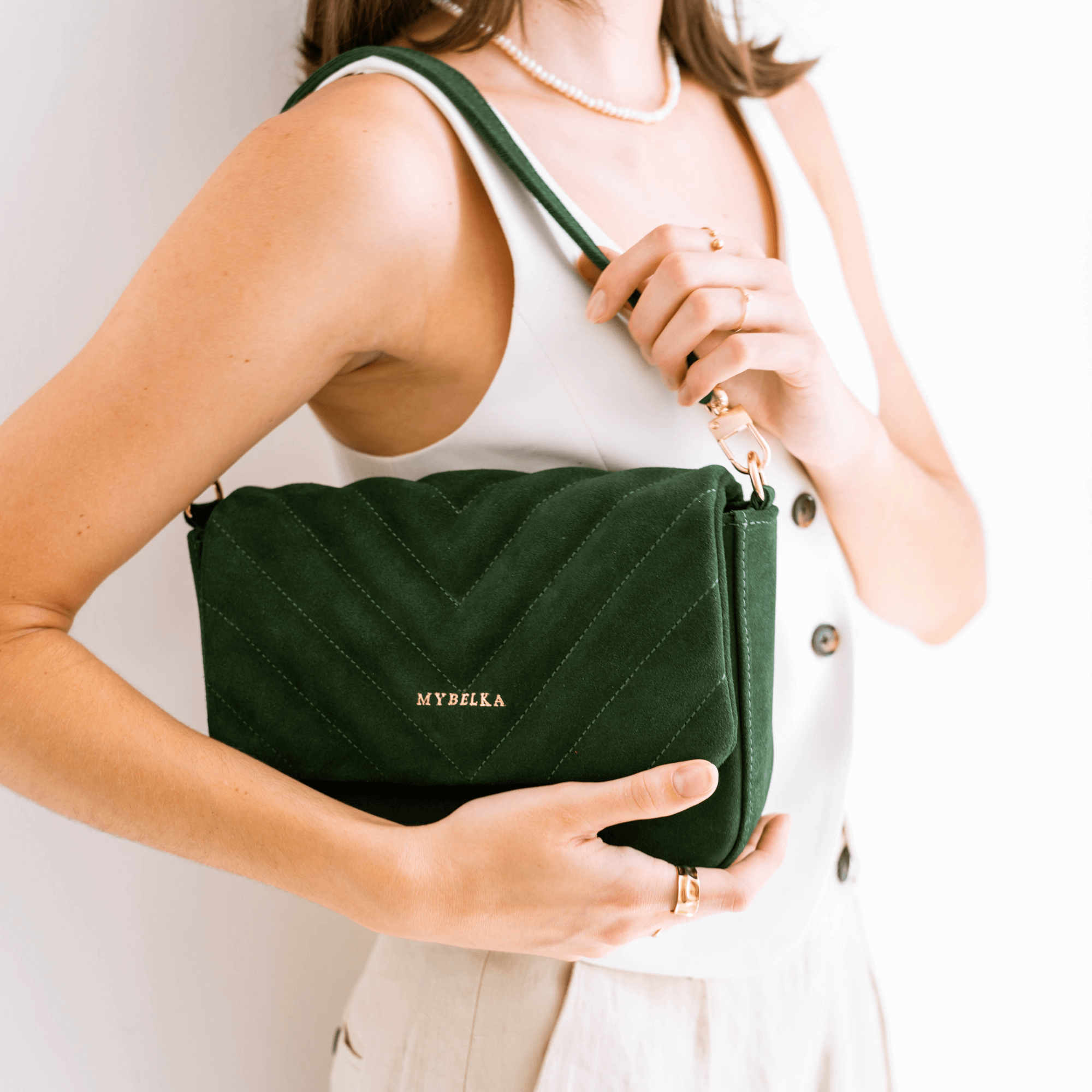 Kabelka Alma v kůži lahvově zelený semiš, se zlatým kováním, vínovou podšívkou a širokým páskem. Na kabelce není možné provádět úpravy, jedná se o již ušitý produkt, který je ihned k odeslání.