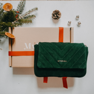 Kabelka Alma v kůži lahvově zelený semiš, se zlatým kováním, vínovou podšívkou a řetízkovým páskem. Na kabelce není možné provádět úpravy, jedná se o již ušitý produkt, který je ihned k odeslání.