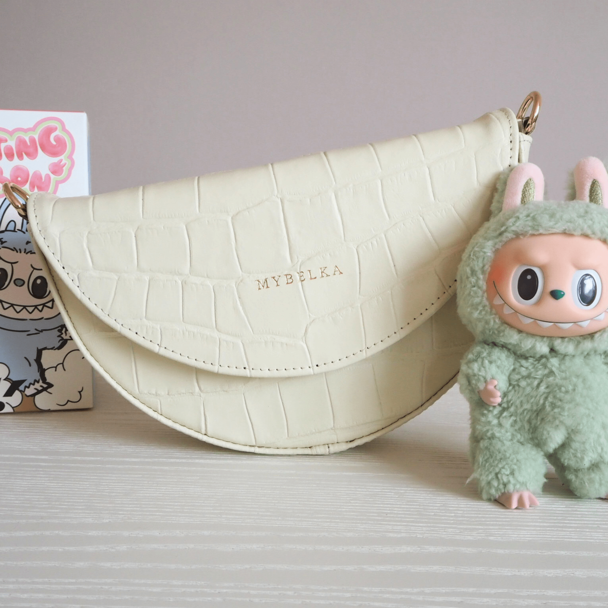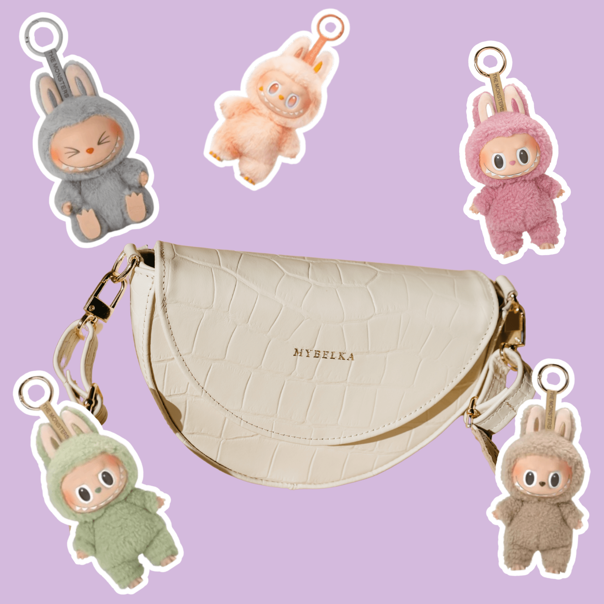 Kabelka Luna v krémovém krokodýlu se zlatým kováním a vínovou podšívkou je sama o sobě šperk. V tomto setu ji navíc doplňuje jedna z nejžádanějších postaviček sezóny – roztomilá sběratelská figurka Labubu z oficiální edice značky Pop Mart. Vybrat si můžeš mezi dvěma variantami: Have a Seat nebo Tasty Macarons.