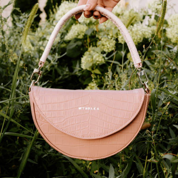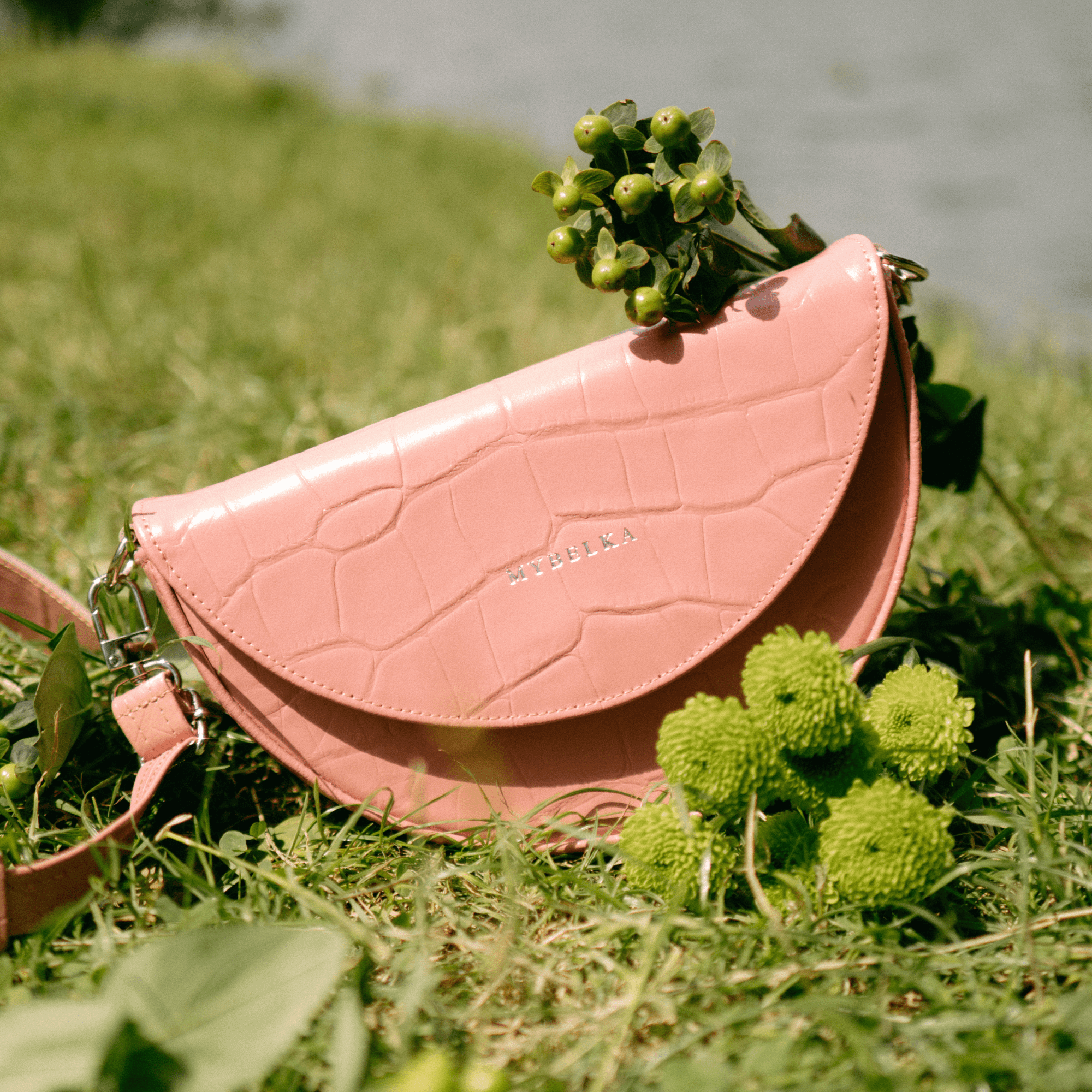 Kabelka Luna v kůži krokodýl růžový, se stříbrným kováním, šedou podšívkou a širokým páskem. Na kabelce není možné provádět úpravy, jedná se o již ušitý produkt, který je ihned k odeslání.