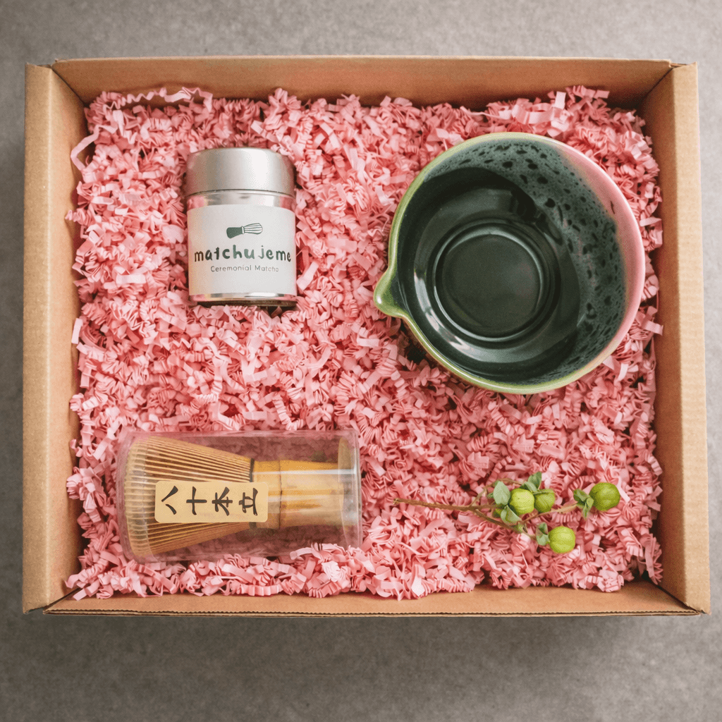 Obsahuje vše, co potřebuješ k opravdovému matcha rituálu — 30 g ceremoniální matchy Matchujeme, ručně vyráběný chawan se zobáčkem v jemné růžovo-zelené kombinaci a klasický bambusový chasen se 100 proutky.