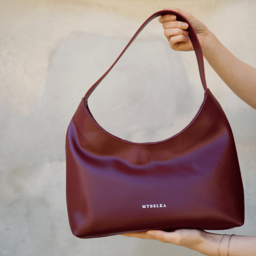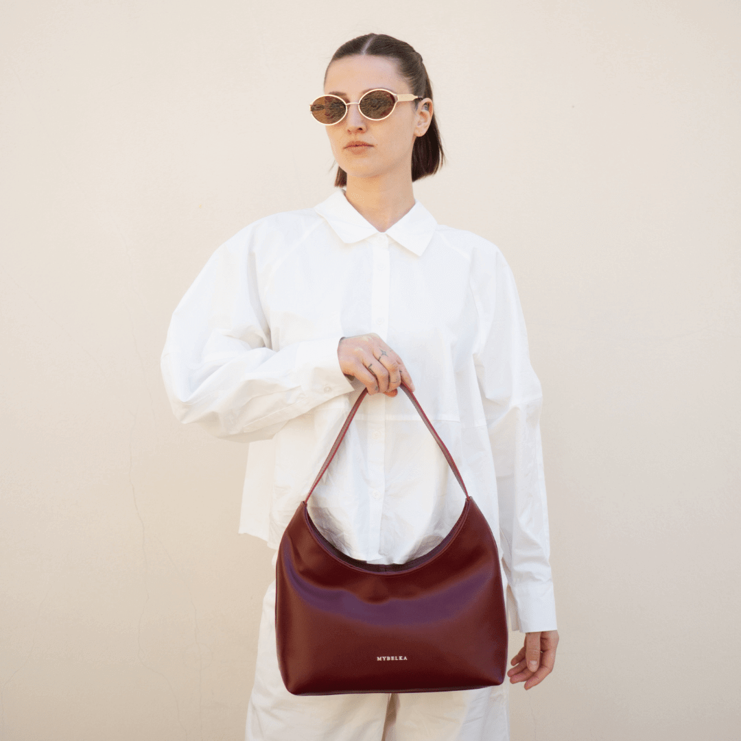 Kabelka Noemi v kůži hladká vínová, se stříbrným kováním a šedou podšívkou. Na kabelce není možné provádět úpravy, jedná se o již ušitý produkt, který je ihned k odeslání.